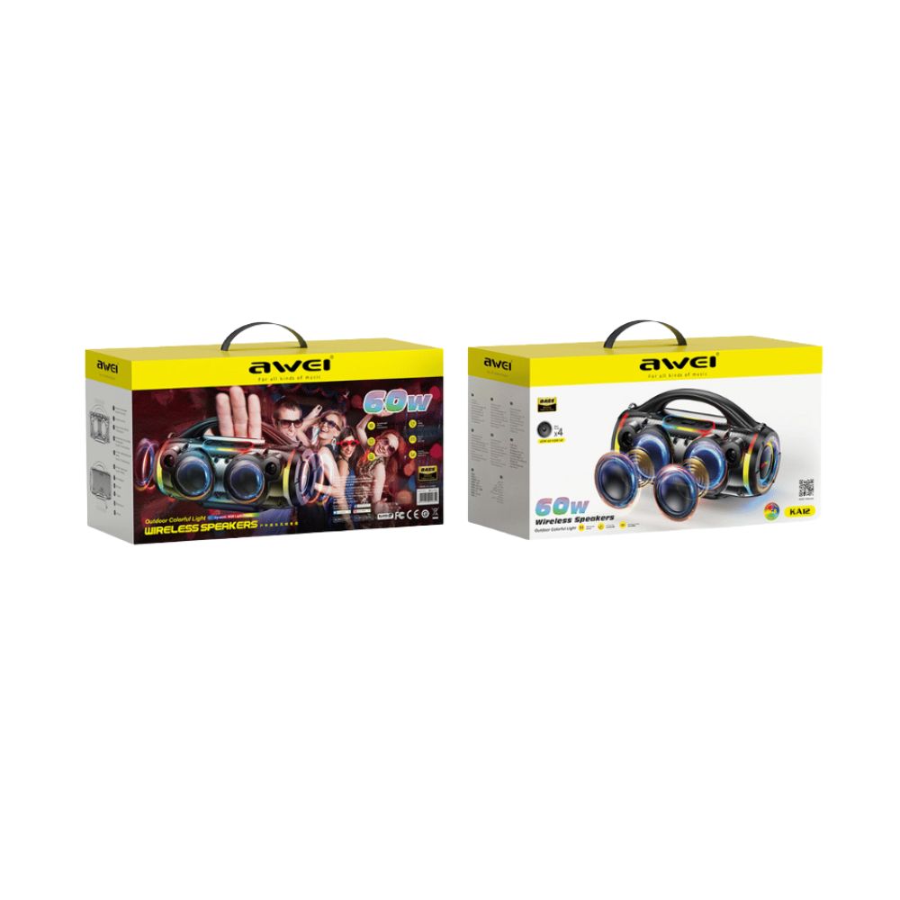 Awei KA12 60W Wireless RGB Outdoor Speaker. With a 60W speaker output and an advanced D-Class amplifier chip, the AWEI KA12 ensures rich and dynamic sound. Its signal-to-noise ratio of ≥80dB minimizes distortion, while the 20Hz–20KHz frequency response covers a wide audio range, enhancing clarity.