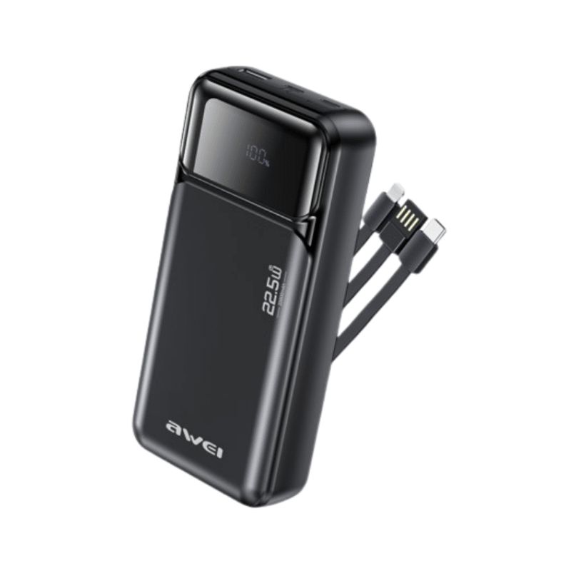 Awei PA‑93 20000mAh 22.5W Fast Charging Power Bank with Built‑in Dual Cables. High‑density lithium polymer battery provides multiple full charges for most smartphones (e.g., 4‑5 charges for iPhone 15, 3‑4 charges for Samsung Galaxy S24). Perfect for extended travel, camping, or multi‑day events.