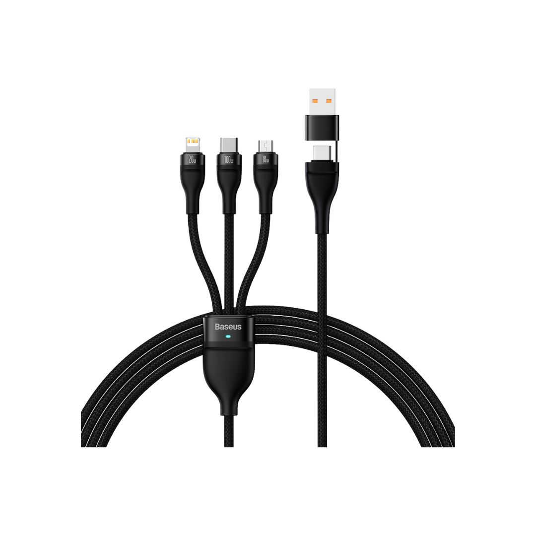 Baseus 3-in-2 100W Universal Fast Charging Cable. Charge All Your Devices with One Cable. The Baseus 3-in-2 100W Universal Fast Charging Cable offers a versatile solution for charging various devices with one cable. It features a single connector (e.g., Type-C) that supports multiple output connectors (e.g., Type-C, Lightning, Micro-USB). This allows users to charge devices like smartphones, tablets, and even some laptops using a single cable. The cable also supports fast charging up to 100W, ensuring efficient charging of various devices.