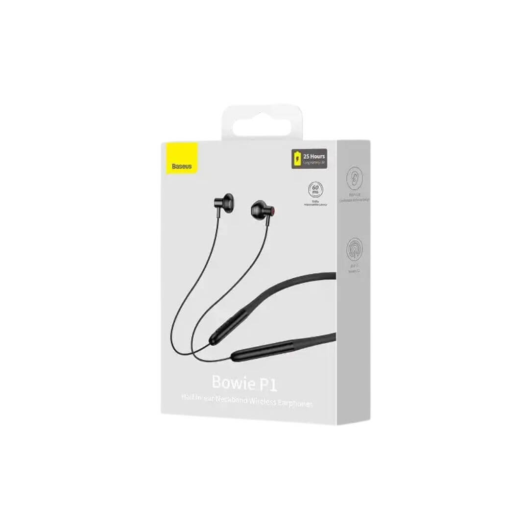 Baseus Bowie P1 Half In-ear Neckband Wireless Earphones. The Baseus Bowie P1 Half-In-Ear Neckband Wireless Earphone features a 14mm PET diaphragm coil for excellent sound quality.