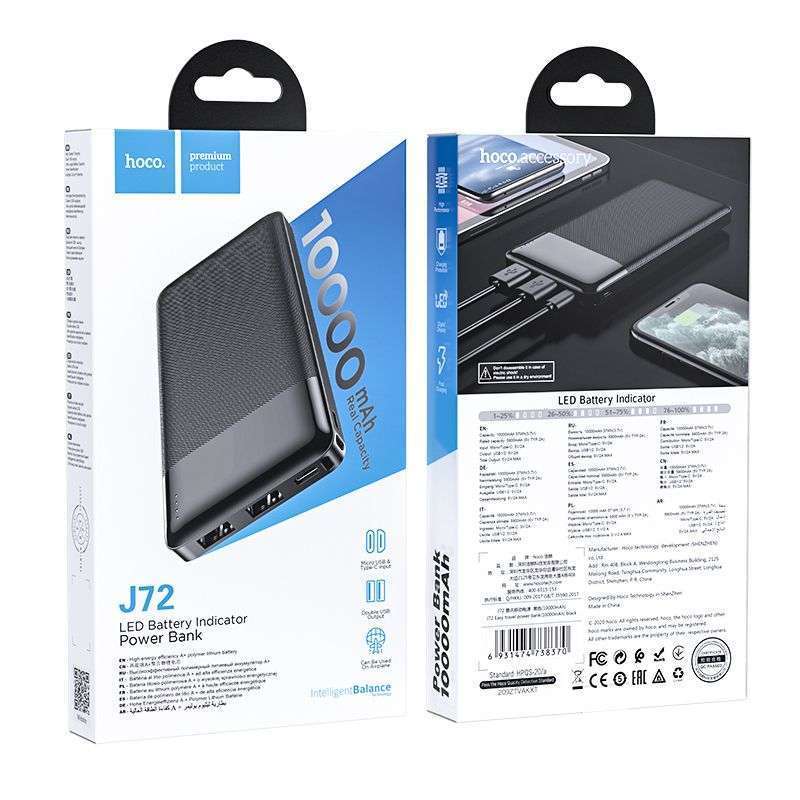 Hoco J72 Travel Power Bank. Hoco J72 Easy Travel 10000mAh Power Bank with LED Battery Indicator Intelligent Powerbank. Stay powered up and connected wherever you go with this sleek and efficient power bank. With a high-capacity 10000mAh battery (rated capacity: 5900mAh), you’ll have enough juice to keep your devices charged throughout the day. The Hoco J72 supports both Micro and Type-C inputs, ensuring compatibility with a wide range of devices. The dual USB-A outputs (5V/2A each) allow you to charge two devices simultaneously, with a total output of 5V/2A. Keep track of your power bank’s status with the built-in LED light display. You’ll always know how much charge is remaining, so you’re never caught off guard.