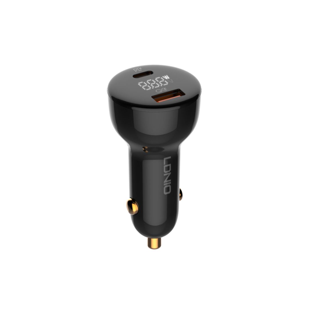 LDNIO C101 100W Dual USB Super Fast Car charger. Quick charge technology 100W charging and offers fast charging. LED display indicates car battery voltage, charging voltage, and current.