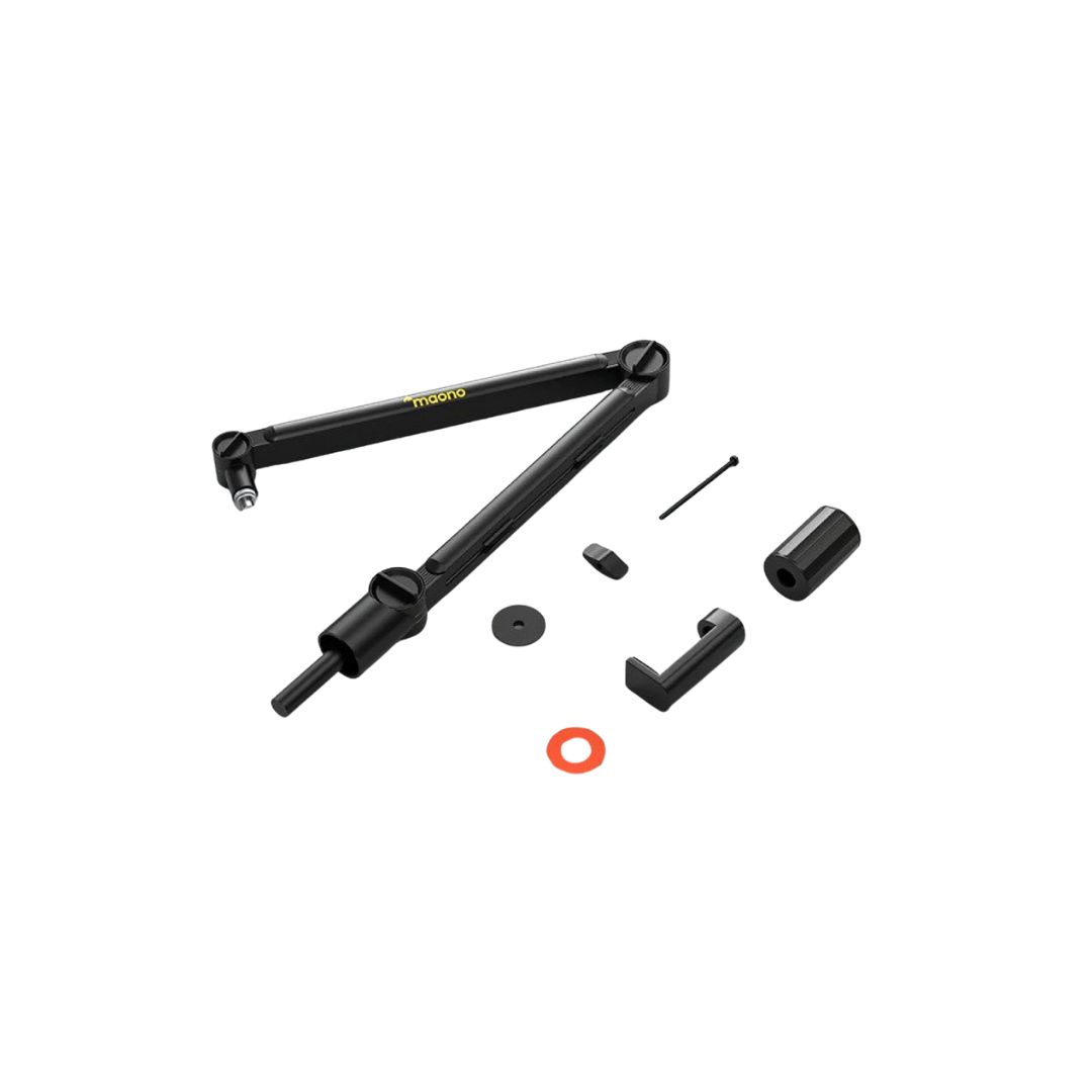 Maono BA91 Microphone Suspension Boom Arm Stand. It is a sturdy, low-profile boom arm made from premium metal, featuring a quiet internal spring system and three flexible joints for effortless mic positioning. It can hold microphones up to 1.8 kg securely, attaches to desks with a padded C-clamp, and includes built-in cable management to keep your setup organized. With universal 3/8″ and 5/8″ thread compatibility, it works seamlessly with popular mics like Blue Yeti, Rode PodMic, HyperX QuadCast, Shure SM7B, and Maono models.