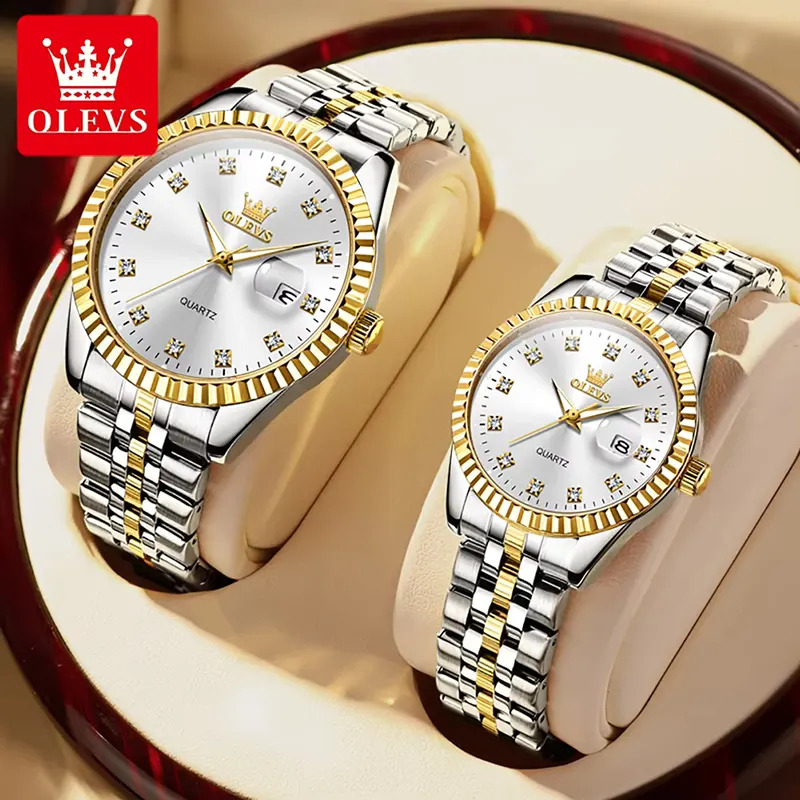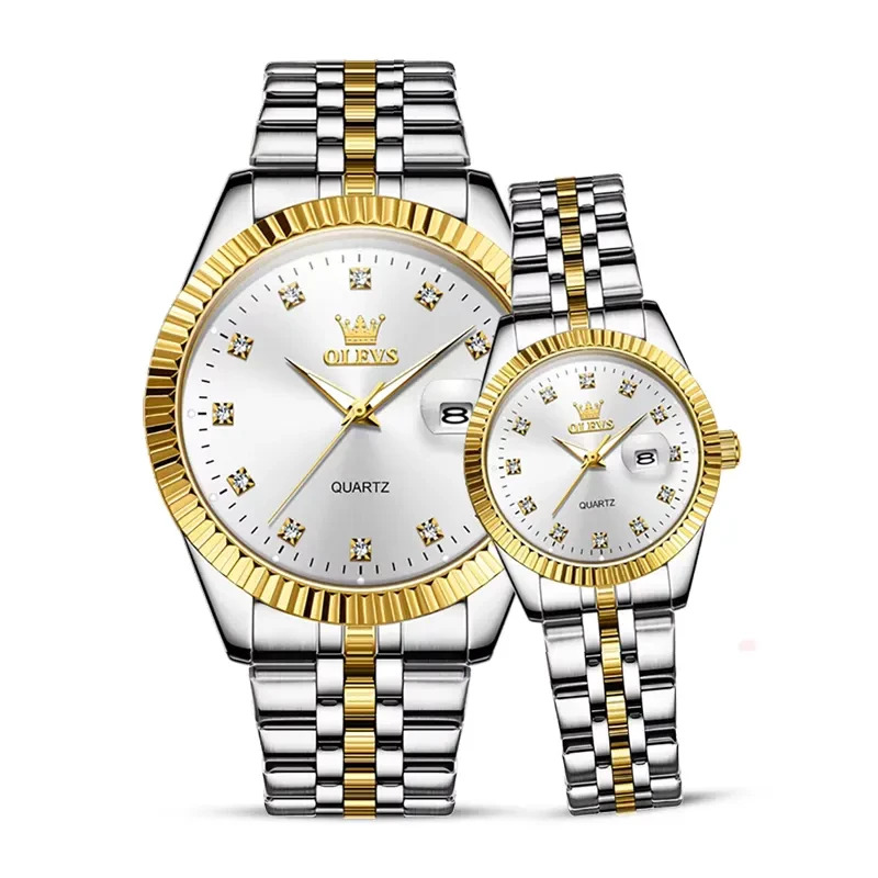 Olevs 5526 Luxurious White Dial Two-tone Couple Watch. The OLEVS 5526 Luxury Quartz Watch for Couples is a beautifully designed timepiece with a stainless steel strap and high hardness coated glass mirror. It’s a romantic gift that features 12 diamonds and a night-light function for easy reading. Perfect for recording special moments with your loved one.