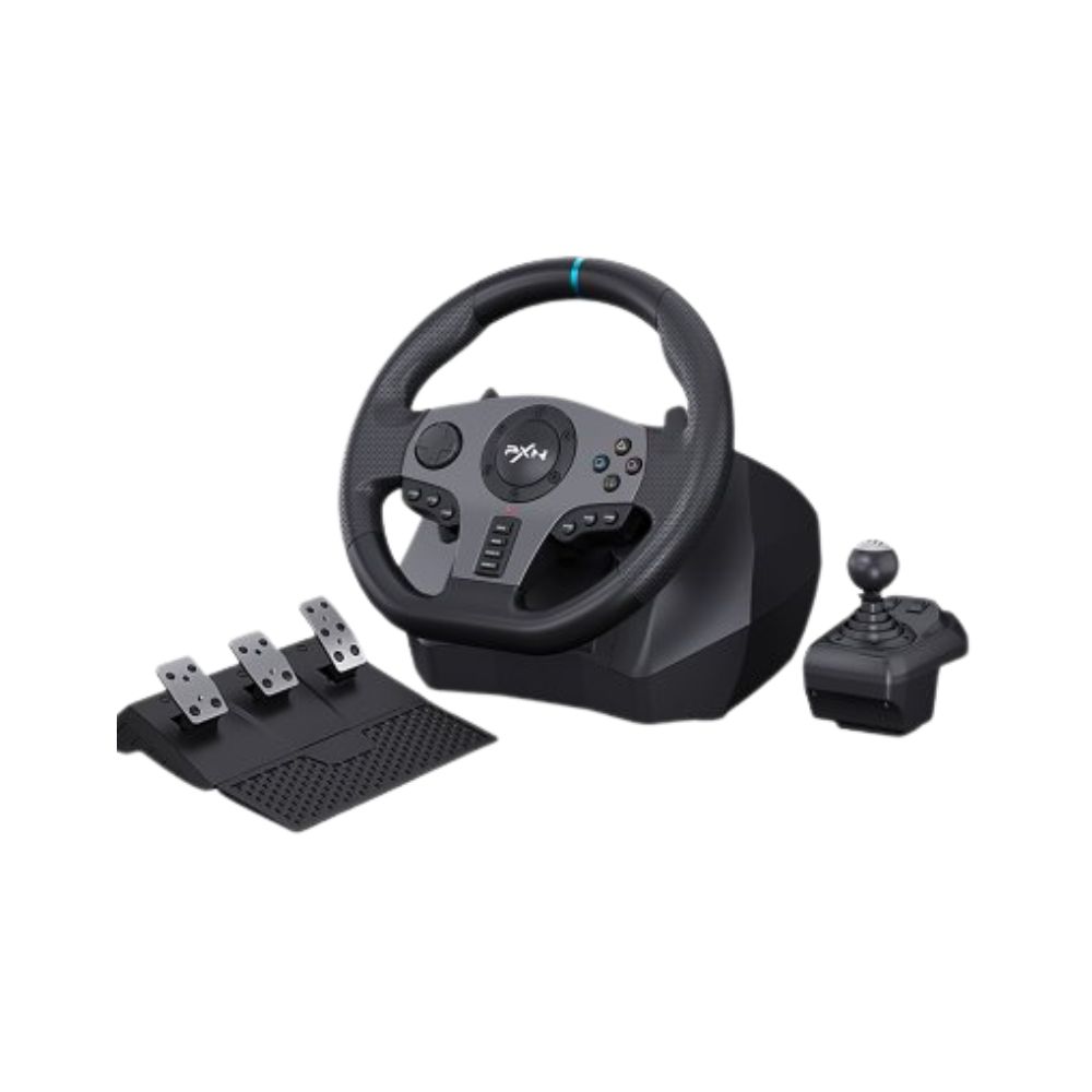 PXN V9 Gen 1 Gaming Racing Wheel. Realistic Racing Wheel Racing game fans, feel the thrill of the track with the PXN V9 steering wheel! This complete setup includes the wheel itself (with 270° or 900° rotation modes), a pedal set (accelerator and brake), and a 6+1 speed shifter for manual gear changes. Dual-motor force feedback delivers realistic vibrations and resistance based on in-game action. It’s compatible with PC, PS4, PS3, Xbox One, Xbox Series X/S, and Nintendo Switch.