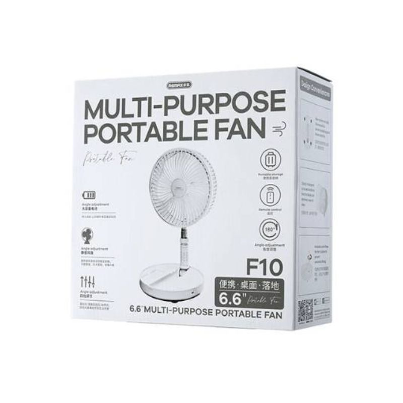 Remax F10 Portable 6.6-Inch Rechargeable Multi-Purpose Desk Fan a pintsized powerhouse thats as versatile as it is compact giving you the freedom to adjust airflow with four nifty speed modes. Armed with a robust 4800mAh battery and easypeasy USB TypeC charging this fan ensures topnotch performance with a side helping of convenience. Take it for a spin literally as it swivels a full 180 degrees for optimal air circulation. Plus the cherry on top? A remote control that elevates userfriendliness to new heights. Whether youre on the move at work or chilling at home this fan is your trusty companion for cool comfort anytime anywhere.