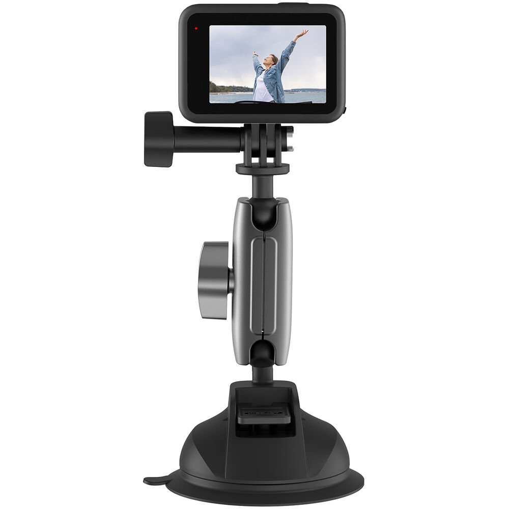Telesin Aluminum Alloy Camera Suction Cup Mount. Use this Suction Cup Camera Mount from TELESIN to secure your action camera to a vehicle for dynamic driving shots. Two articulating sections can move the arm and camera 360° for optimal placement. The integrated 3-prong mount and locking screw are compatible with GoPro action cameras, while an included 1/4″-20 adapter works with compact mirrorless cameras less than 1.3 lb, Insta360 cameras, or a smartphone clamp. Fold the suction mount flat for easy storage in your camera bag. Its aluminum alloy and stainless steel construction makes for a lightweight and durable design.